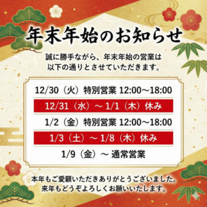 年末年始のお知らせ 誠に勝手ながら、年末年始の営業は以下の通りとさせていただきます。 12/30 (火) 特別営業 12:00~18:00 12/31 (水) ~ 1/1 (木) 休み 1/2 (金) 特別営業 12:0 […]